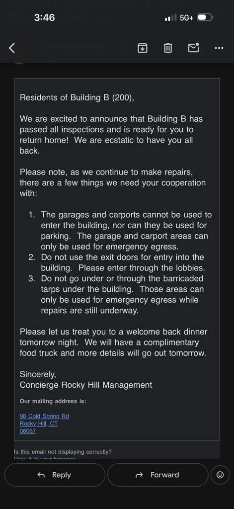 At 3:42pm on Thursday, February 19, residents of Concierge building 200 received an email saying “Building B has passed all inspections and is ready for you to return home”. The email was forwarded by a resident of building 200.