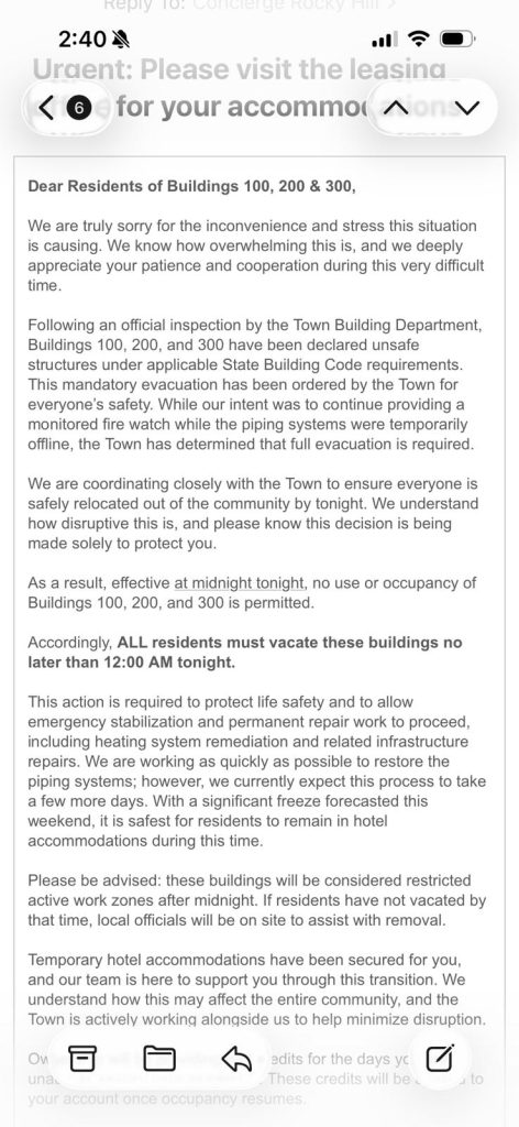 This action is required to protect life safety and to allow emergency stabilization and permanent repair work to proceed, including heating system remediation and related infrastructure repairs. We are working as quickly as possible to restore the piping systems; however, we currently expect this process to take a few more days. With a significant freeze forecasted this weekend, it is safest for residents to remain in hotel accommodations during this time.