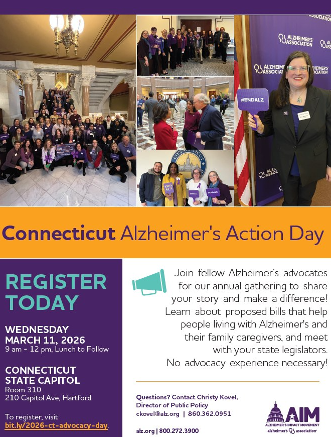 The CT Chapter of the Alzheimer’s Association invites residents to join the us for Alzheimer’s Action Day at the State Capitol. Find out how to advocate those with the disease by telling your Alzheimer’s story and hear about new legislation that will assist those with the disease and their caregivers.