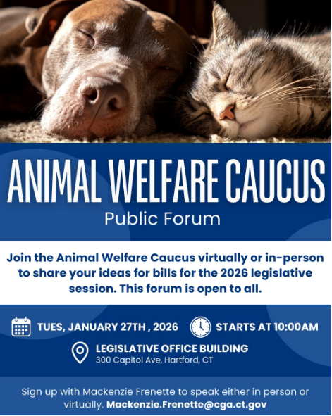 The Animal Welfare Caucus will meet at 10 a.m. at the Legislative Office Building in Hartford. Please come and share your ideas for how we can improve our laws protecting our furry friends ahead of the legislative session slated to begin in early February.