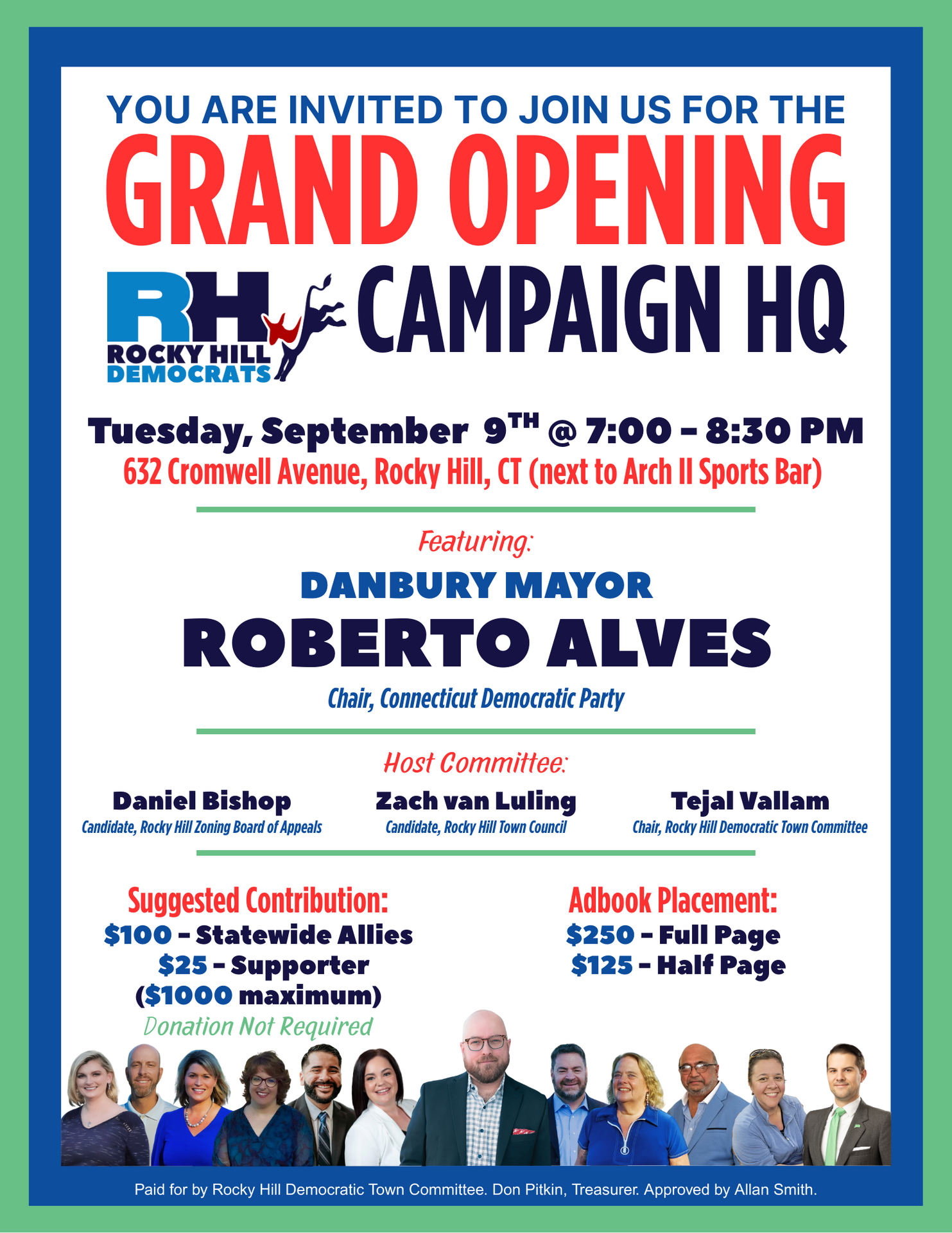 We are excited to invite everyone to the Grand Opening of our HQ with the amazing and talented Mayor of Danbury as well as the Chair of the CT Democratic Party, Roberto Alves! Please invite your friends and neighbors to meet our Mayoral Candidate, Allan Smith, and all our Democratic candidates. Event Details are listed […]