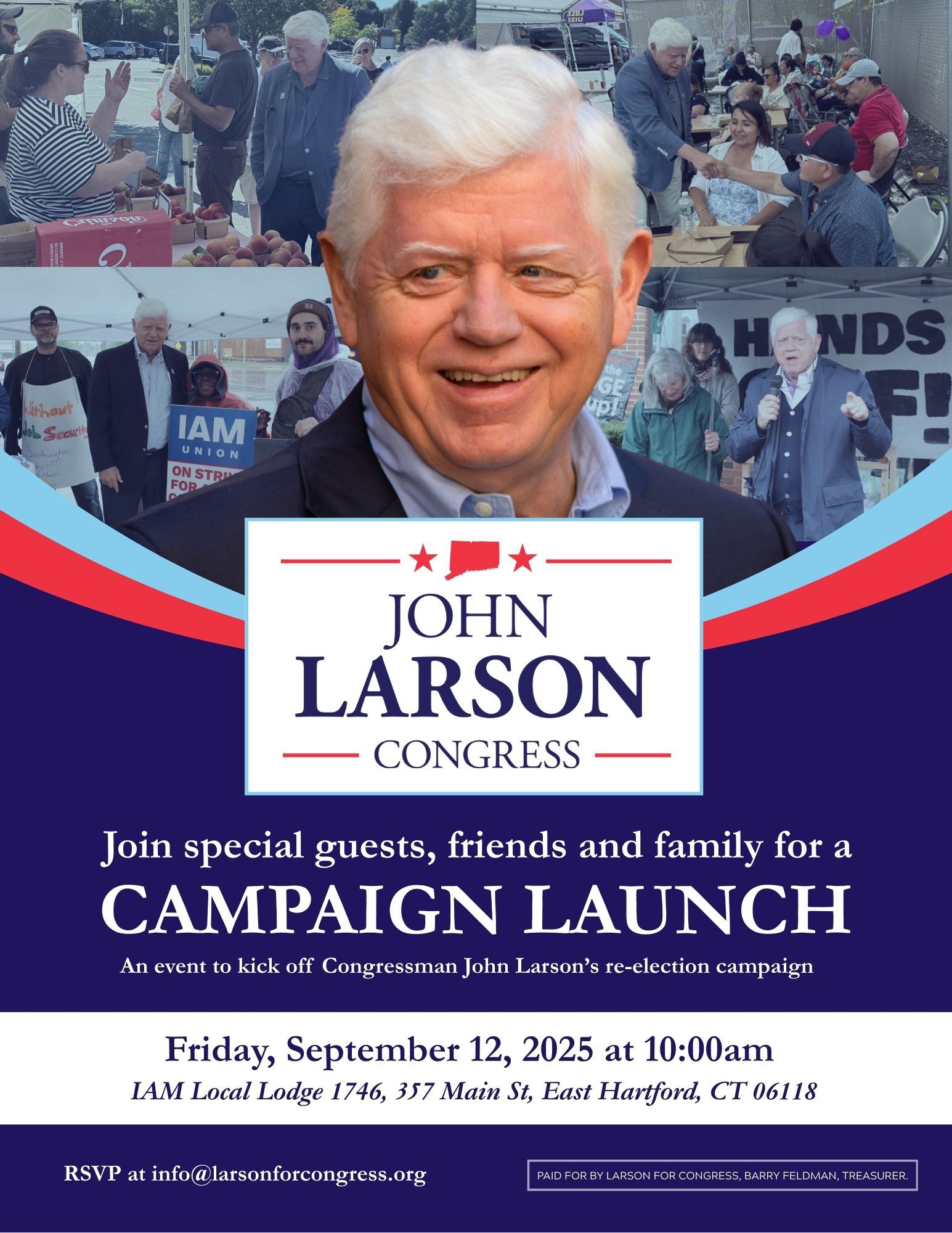 ![]() Join special guests, friends and family for a CAMPAIGN LAUNCHAn event to kick off Congressman John Larson’s re-election RSVP at info@larsonforcongress.org |