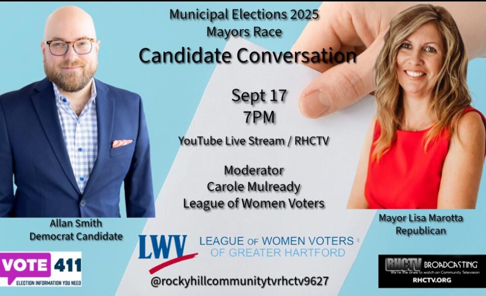 ![]() The League of Women Voters hosts a discussion between Rocky Hill Mayoral Candidates Allan Smith and Lisa Marotta. Tune in for a frank and honest discussion about the state of Rocky Hill and the candidates’ vision for the future. The debate will be aired on Cox Rocky Hill channel 14 and YouTube. |