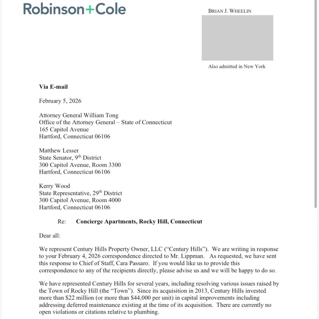 On Thursday February 5, a lawyer representing Concierge sent a response to A.G. Tong, State Senator Matt Lesser, and State Representative Kerry Wood.