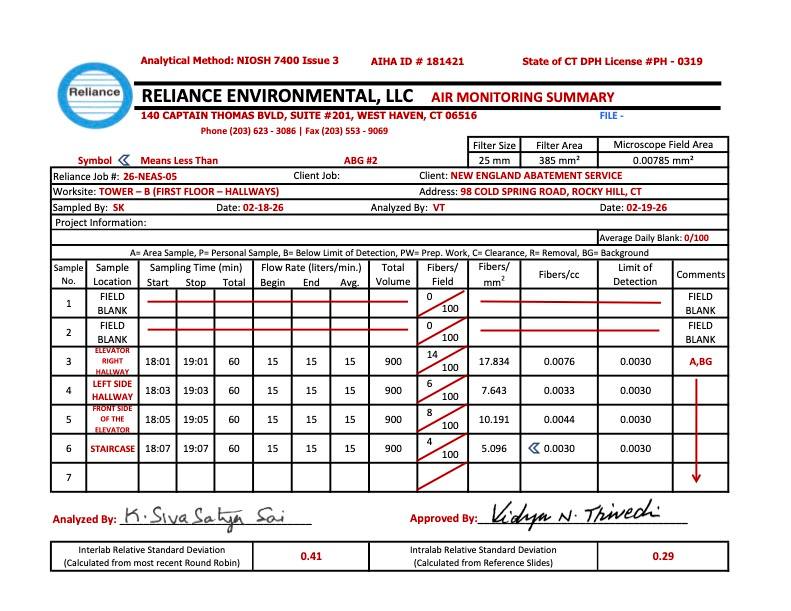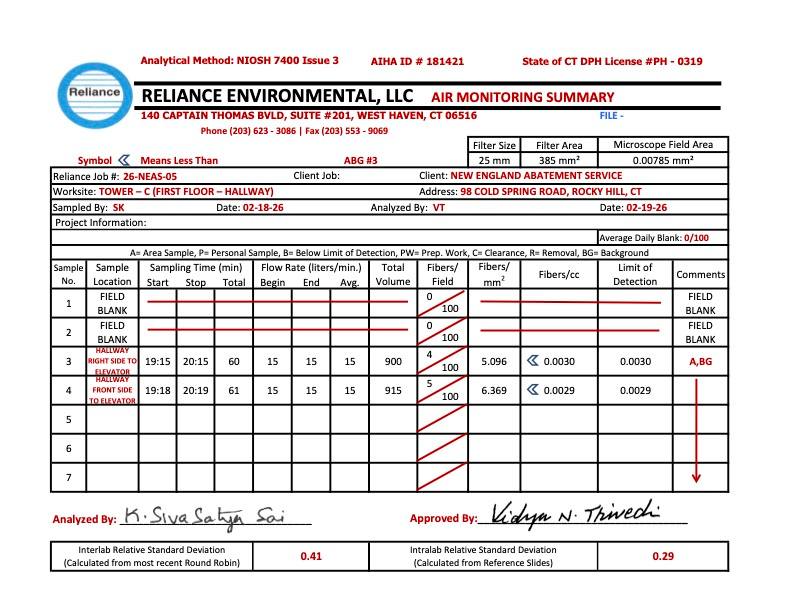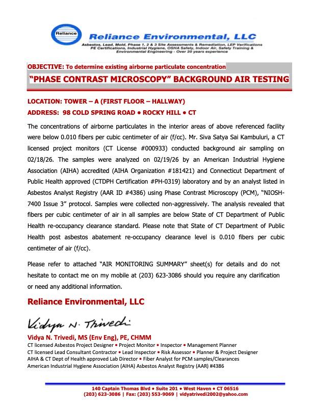 We recognize that residents remain understandably concerned, particularly following information shared about asbestos in the 100 (Building A). Prior to approving re-entry to Building 200, our Building Official required that Concierge conduct air quality testing for asbestos in the connected 100, 200, and 300 buildings. The results showed all samples were below the Connecticut Department of Public Health re-occupancy clearance standard. (See attached documentation)