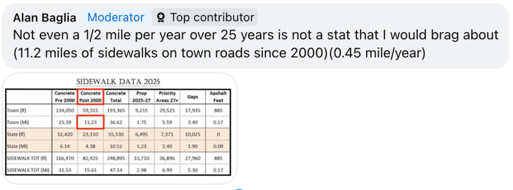 ⅓ of a mile of sidewalk is underway. By the Town’s own data, Rocky Hill has added 11 miles of sidewalks on town roads since 2000. That’s 4/10 of a mile per year over at 25 year span. So 1/3rd of a mile in 2025 is behind even that meager pace.