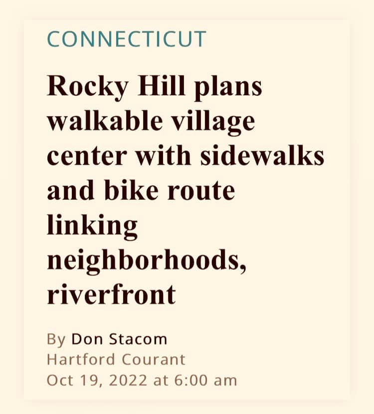 “Rocky Hills Plans Walkable Village Center with Sidewalks and Bike Route Linking Neighborhoods and Waterfront.” Hartford Courant “Smoothing Rocky Hill” (October 19, 2022)